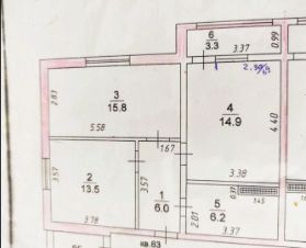 Две большие комнаты (15,8 и 13,5) и кухня с балконом (14,9).