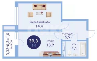 Квартира состоит из просторных жилой комнаты 14.4 кв.м., санузла- 4.3кв.м, прихожей-6кв.м и балкона в целых 4кв.м. А так же кухни в 14кв.м