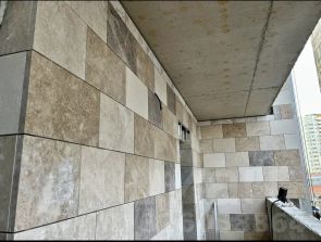 Фасады выполнены из светлого натурального камня.