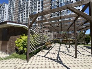 Дворовая территория с ландшафтным дизайном, уютными беседками и мангальной зоной. Детские площадки, спортивные площадки с турникетами, тренажерами, велодорожками. Огромный плюс для автовладельцев - свой подземный паркинг (продаётся отдельно). Дорога до песчаного пляжа на личном транспорте займет минут 10 - 15.