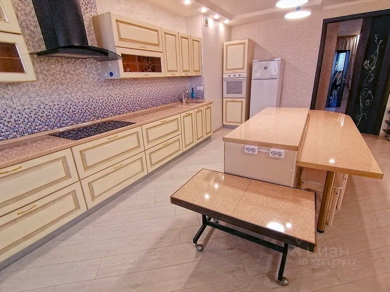 Кухня: Дорогой кухонный гарнитур с уникальной световой разбивкой в рабочей и обеденной зонах.