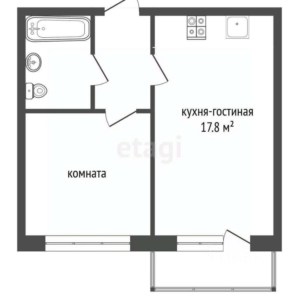 Площадь квартиры составляет 37.4 кв. м., кухня-гостиная 17,8 кв.м., комната 11 кв.м.