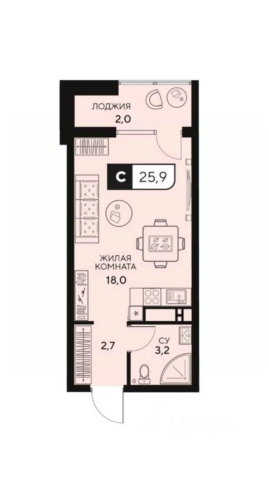 Уютная студия 24 кв метра с теплой лоджией + 2 кв метра с панорамным остеклением