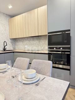 На кухне встроенная бытовая техника, шкафы оборудованы доводчиками, вмонтирована посудомоечная машинка, стол( керамика под стеклом). с мягкими креслами.