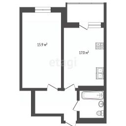 Общая площадь квартиры 42,1 кв. м. Большая просторная кухня 15,9 кв.м., комната 17 кв.м , совмещённый санузел.
