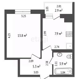 Продается светлая однокомнатная квартира площадью 35 кв. м на восьмом этаже девятиэтажного кирпичного дома.