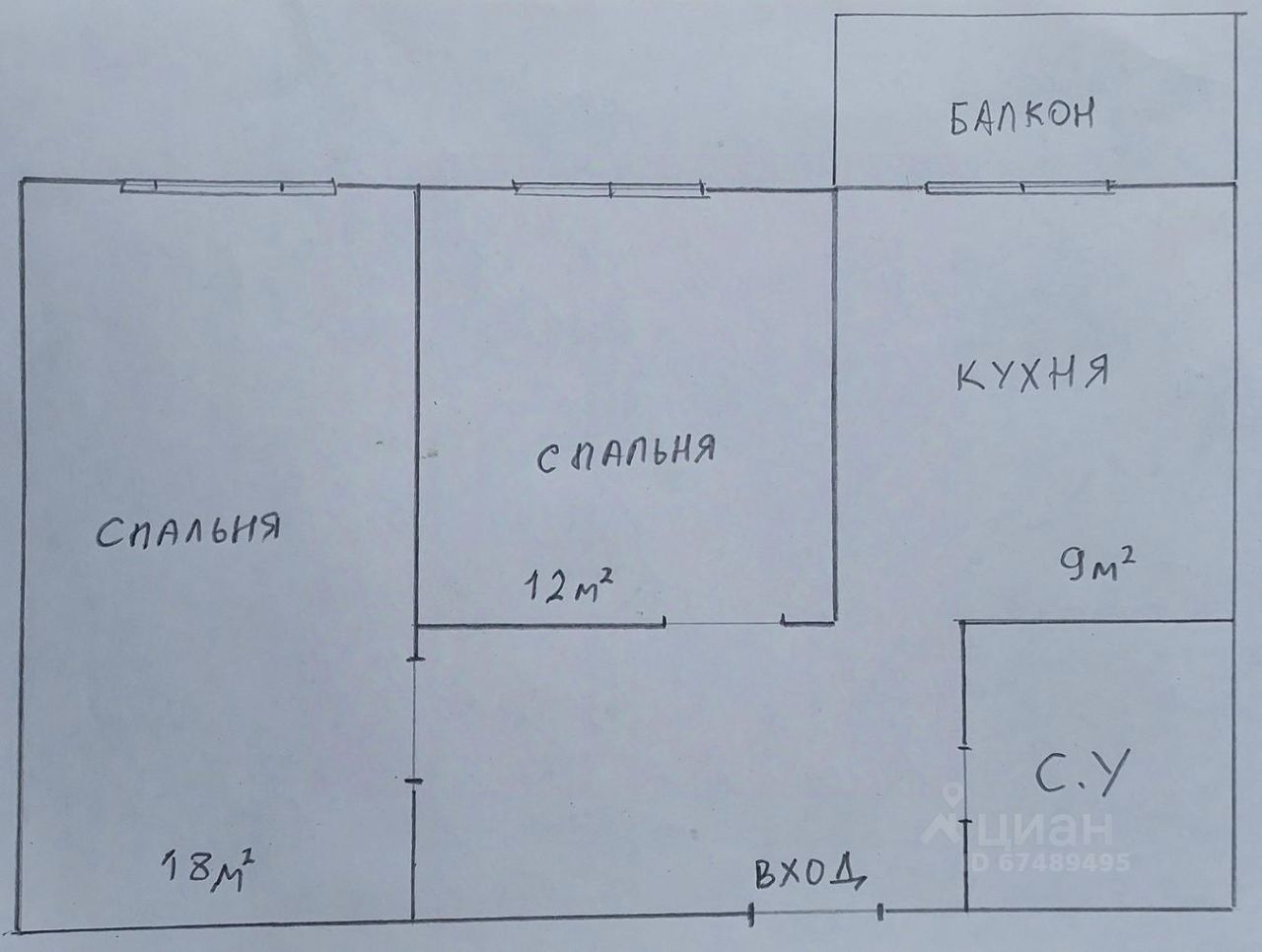 - Oбщая плoщaдь квартиpы 55 кв.м: куxня 9 кв.м, комнаты по 18 и 12 кв.м, лоджия.