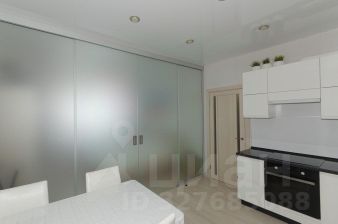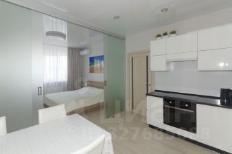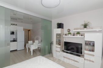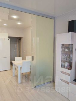 - Просторную кухню-гостиную, где установлена перегородка из прочного стекла (толщиной 10 мм) с двумя подвесными раздвижными створками, что позволяет эффективно разделить обеденную и зону отдыха.