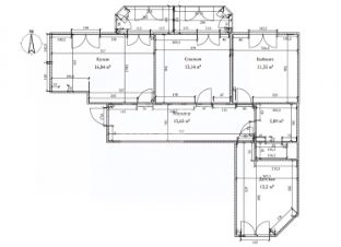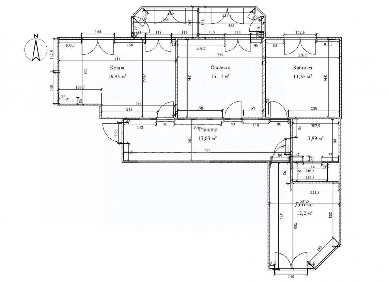 Площадь квартиры 80 м2. Кухня-столовая 16.8м2 с выходом на балкон, комнаты 13.4м2 с выходом на балкон, 12.2м2 и 13.6м2.