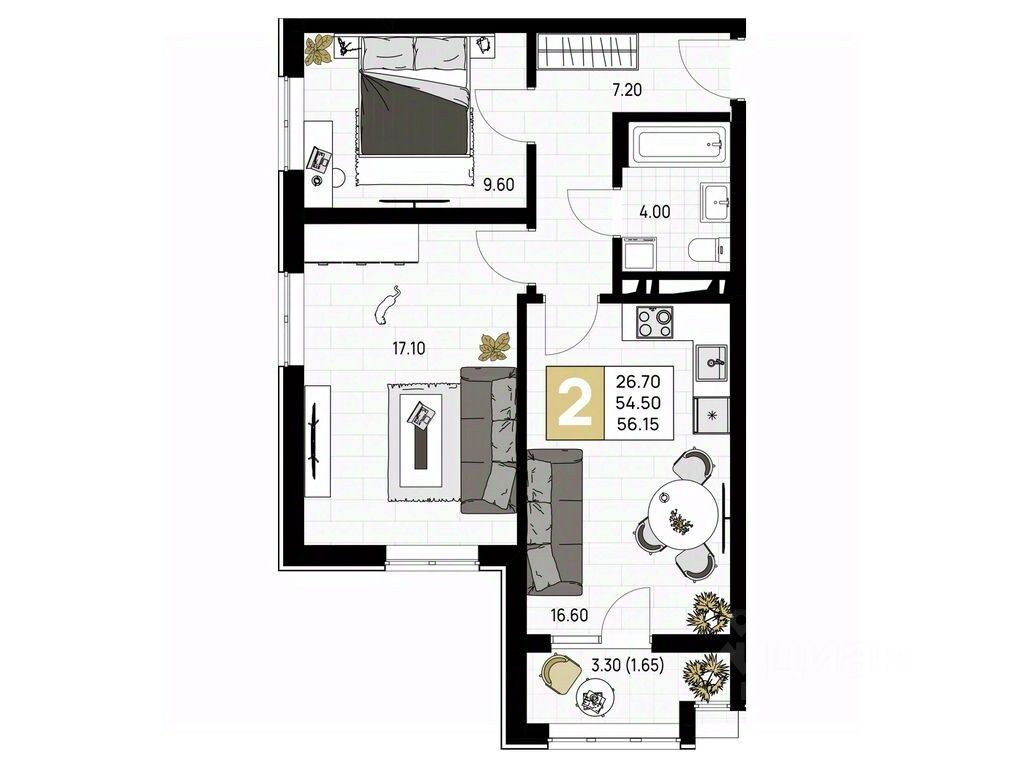 Общая площадь56,15 м²