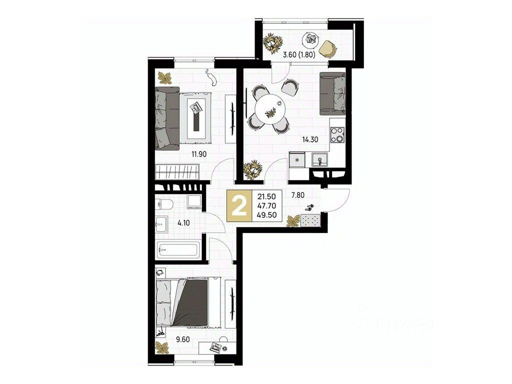 Общая площадь49,5 м²
