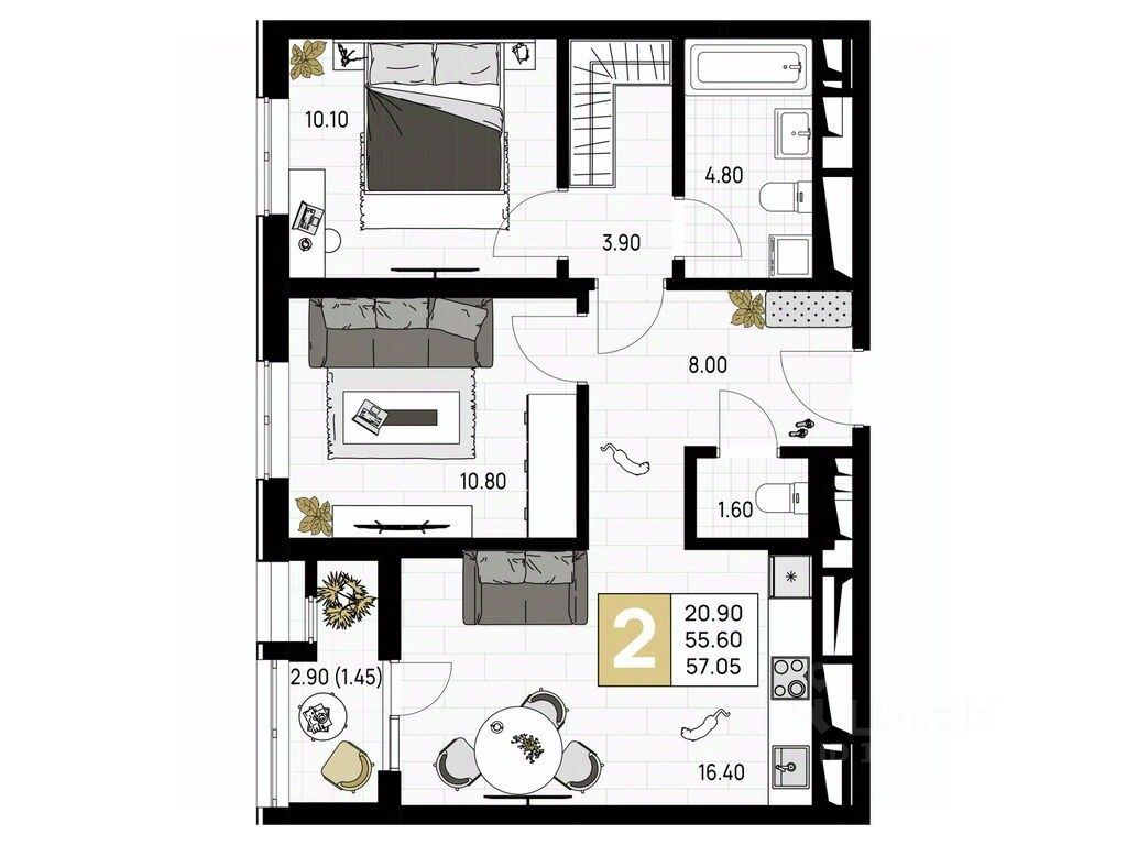 Общая площадь57,05 м²