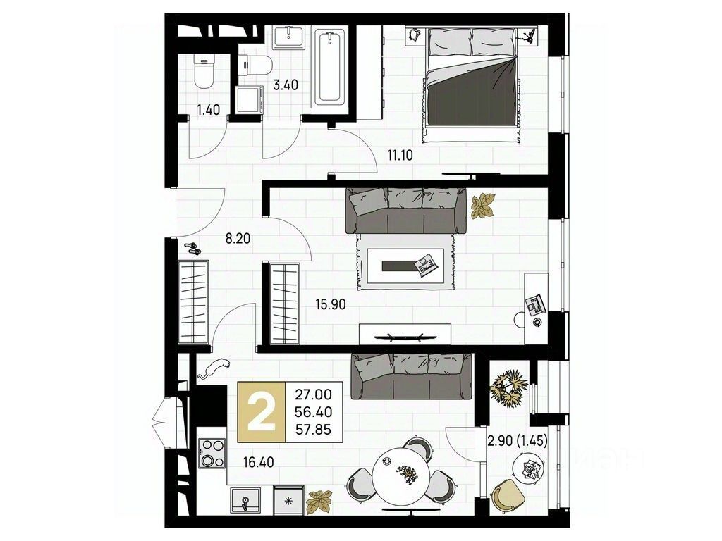 Общая площадь57,85 м²