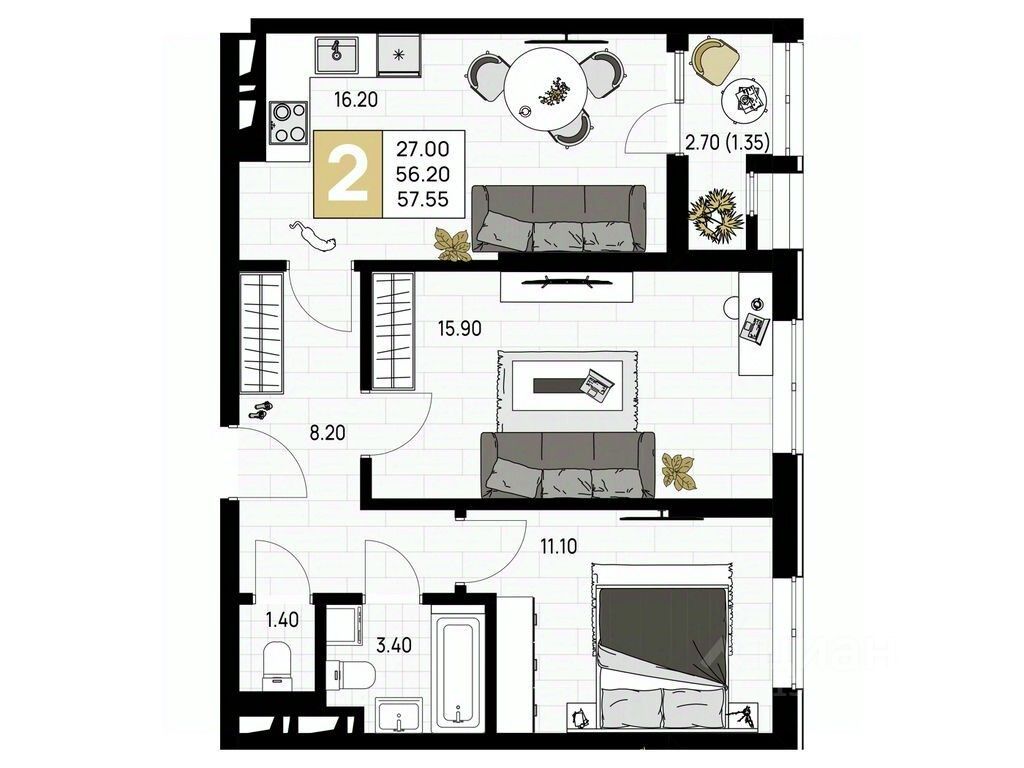 Общая площадь57,55 м²