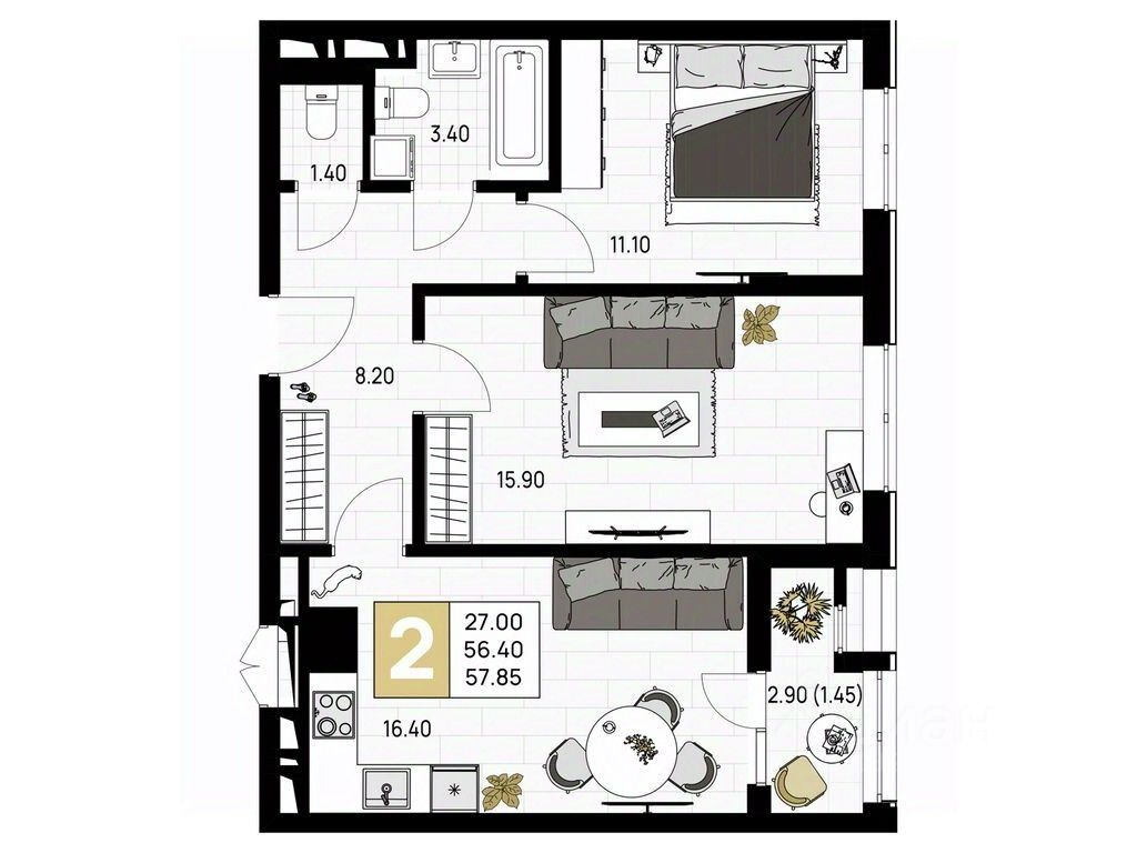 Общая площадь57,85 м²