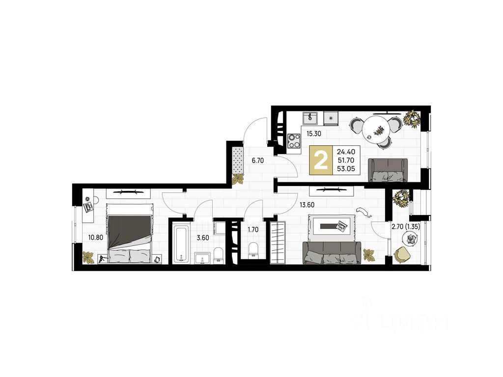 Общая площадь53,05 м²