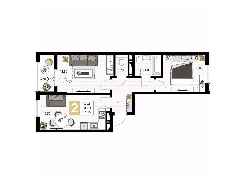 Общая площадь53,35 м²