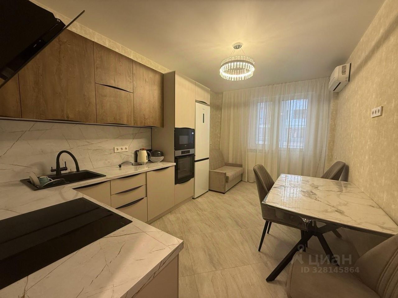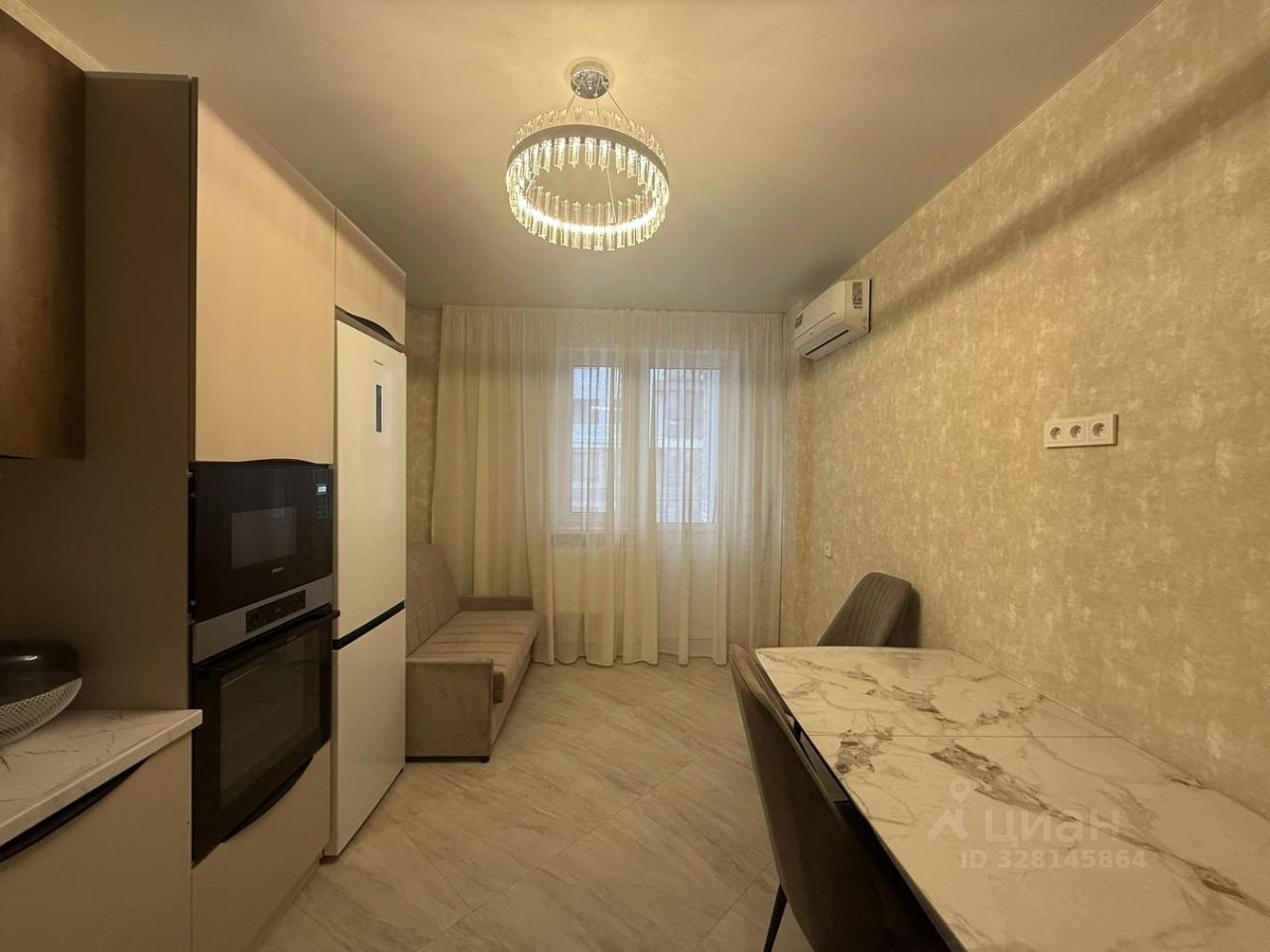 Функциональная кухня-гостиная, встроенная микроволновая печь, духовой шкаф, холодильник, а так же большая рабочая поверхность.