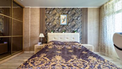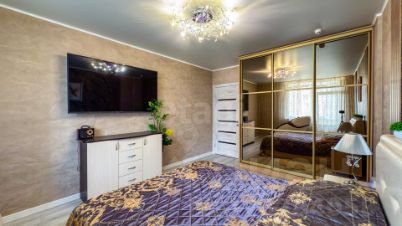 Спальная зона оборудована широкой кроватью с подъемным механизмом, обеспечивающим дополнительное место для хранения, а также трехстворчатым шкафом-купе с продуманной системой хранения.