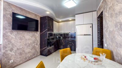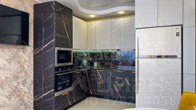 Кухня-гостиная создает ощущение простора и удобства для совместного времяпрепровождения. Кухонный гарнитур новый, выполнен в современном стиле, оснащен встроенной техникой, включая посудомоечную машину и вместительный холодильник, рассчитанный на большую семью.