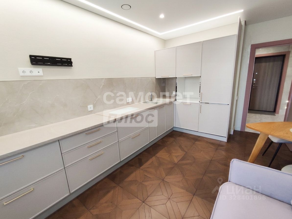 Кухня: встроенный кухонный гарнитур (МДФ фасады) со всей необходимой техникой. Всё встроено, смотрится аккуратно и дорого.
