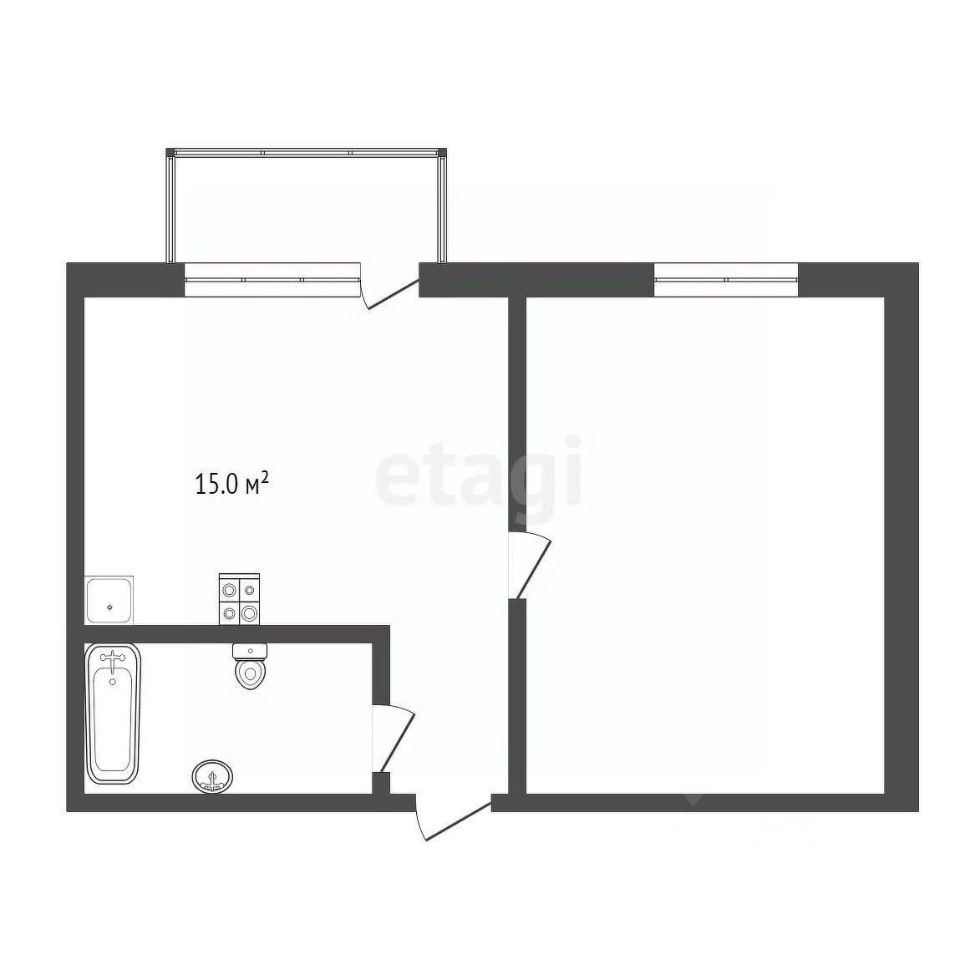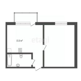 Общая площадь 35,5 кв.м., большая кухня 15 кв.м., жилая комната 15 кв.м.