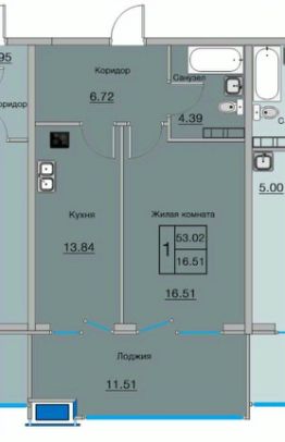 Вторая студия площадью 23 кв.м.: комната 13.8 м2, санузел 3 м2, лоджия 5 м2.