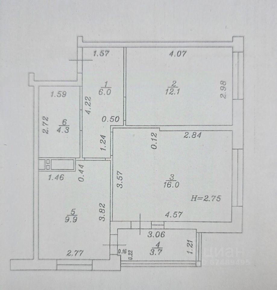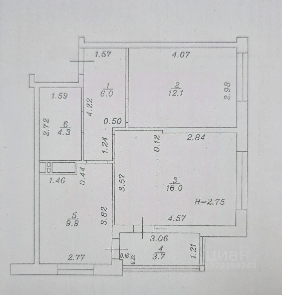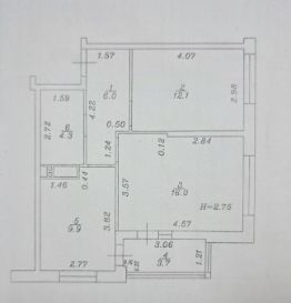 Комфортная планировка квартиры, две комнаты ( 16 кв.м и 12.1 кв.м ) из одной комнаты выход на панорамный балкон (остекление "в пол"), санузел ( 4.3 кв.м ), кухня ( 9.9 кв.м ).