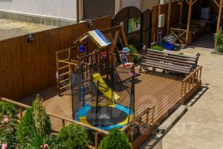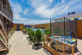 Дом состоит из 2-х этажей, общее количество студий - 18. Участок 5 соток земли , на территории большая летняя кухня, бассейн, детская площадка, лежаки и зона отдыха.