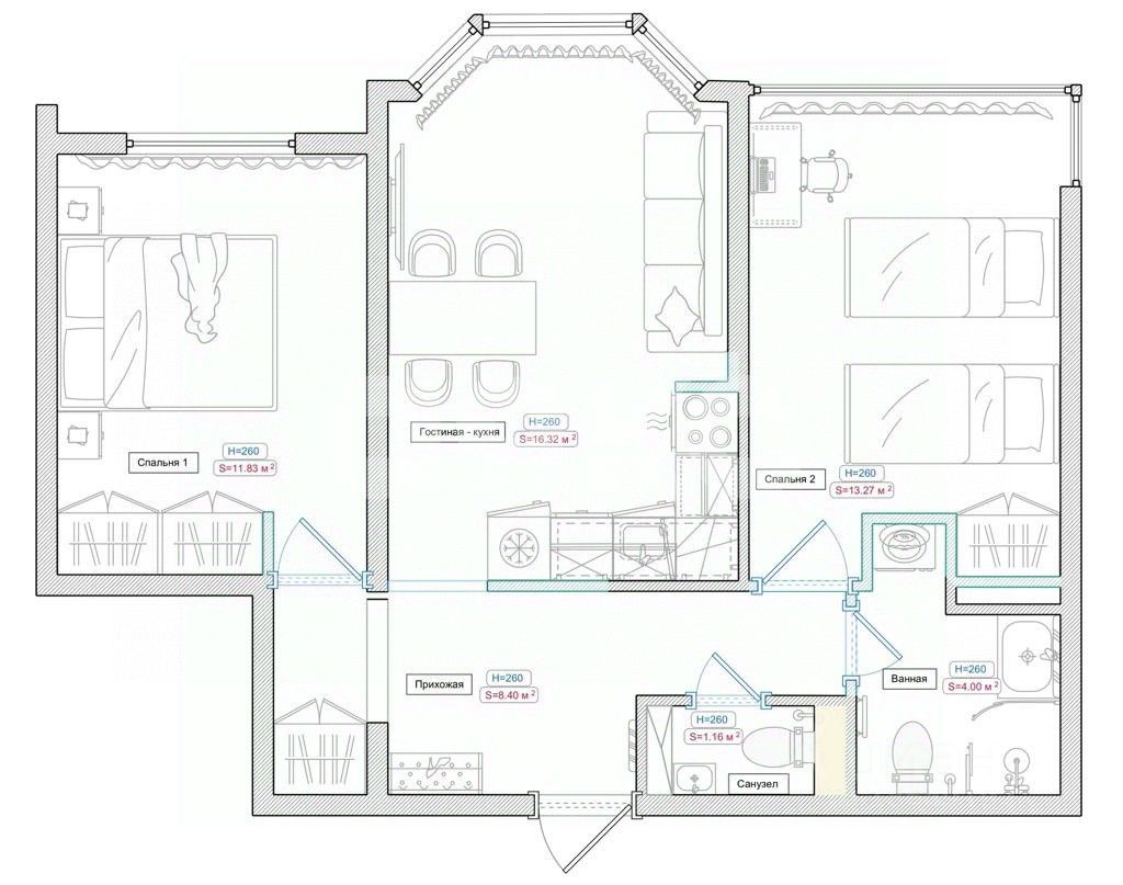 - Спальня 1 (вывод под кондиционер, выводы под бра, ниша под встроенный шкаф-гардеробную, закладные под шторы)