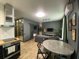 2 комнатная квартира с просторной кухней - гостинной (по факту Евро 3). Ремонт очень стильный и красивый, много точек света, мебель подобрана со вкусом!