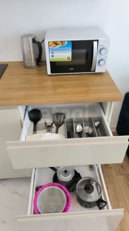 Отдельно хочется остановиться на эстетических и качественных характеристиках отделки, мебели и техники. Приятное сочетание светлых сияющих оттенков с сапфировым бархатом мягкой мебели в интерьере привлекает внимание и сразу создает настроение. А качественная мебель от IKEA и техника ведущих брендов будут исправно служить вашему комфорту.