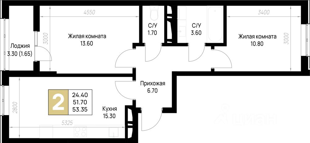 Общая площадь53,35 м²