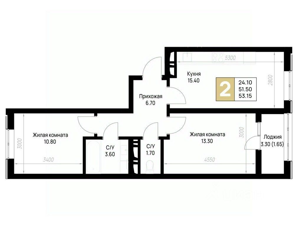 Общая площадь53,15 м²