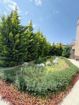 Выполнено полное благоустройство двора. Высажено множество вечно зеленых насаждений, Можжевельник, Туи, Различные декоративные растения.