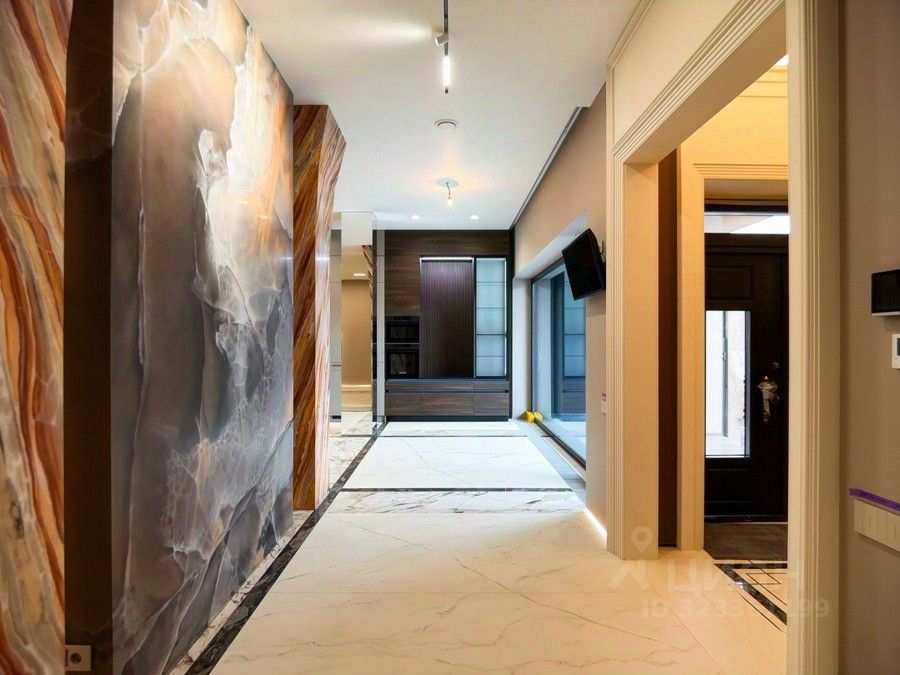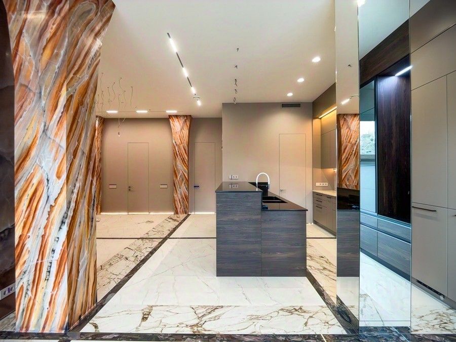 Колонны, камень, светильники, потолки 3,3 м — простор и элегантность.