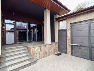 Перед домом — лужайка и парковка, участок отделан натуральным гранитом: красиво и практично.