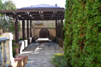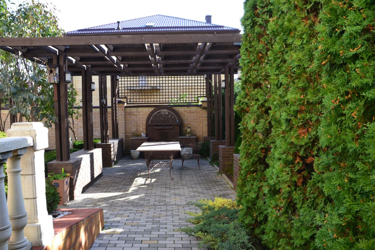 Во дворе ландшафтный дизайн, беседка для отдыха, мангальная зона.
