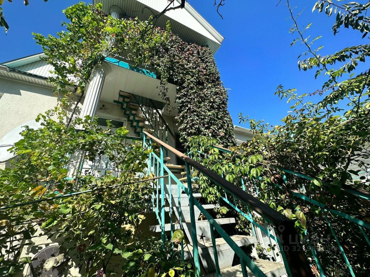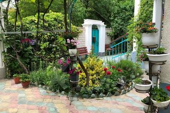 Очень много зелени, насаждений, цветов, виноградная беседка.