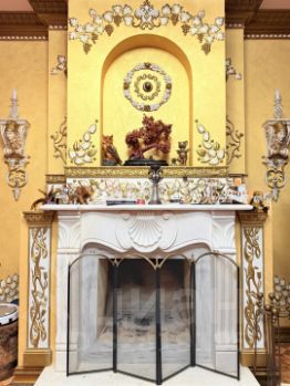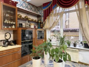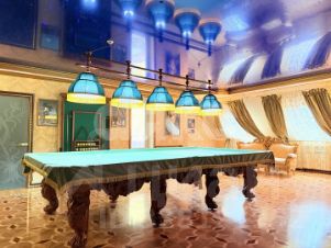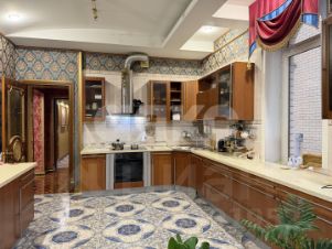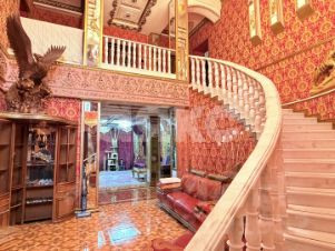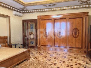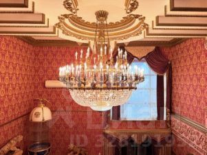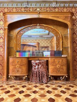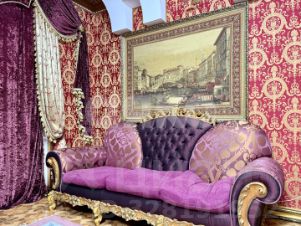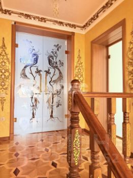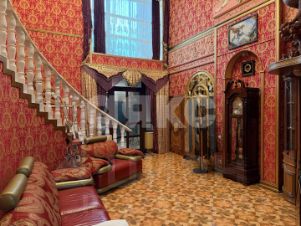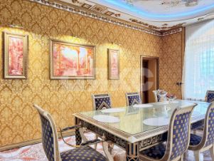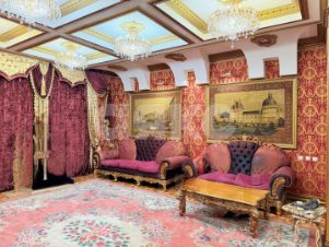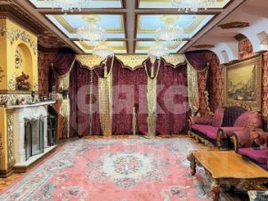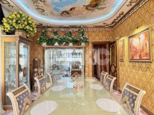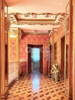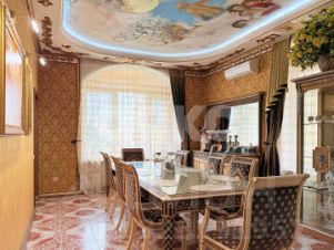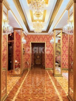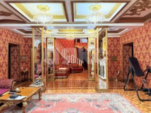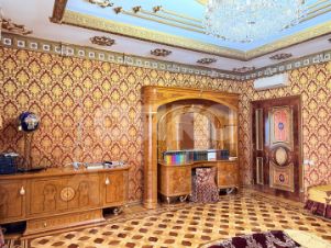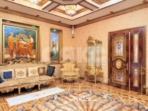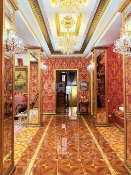 витринные шкафы для коллекций, художественная роспись потолка в столовой, инкрустированные двери и паркет с геометрическим рисунком, подчеркивают статус.