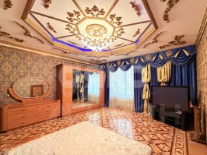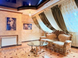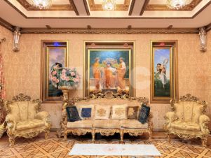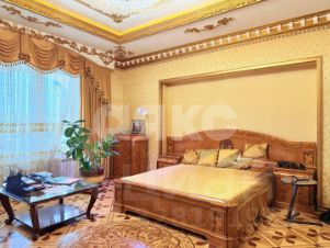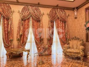 Многоуровневые потолки с авторской лепниной, хрустальными люстрами и текстиль, подобраны в единой палитре благородного золота и теплых тонов.