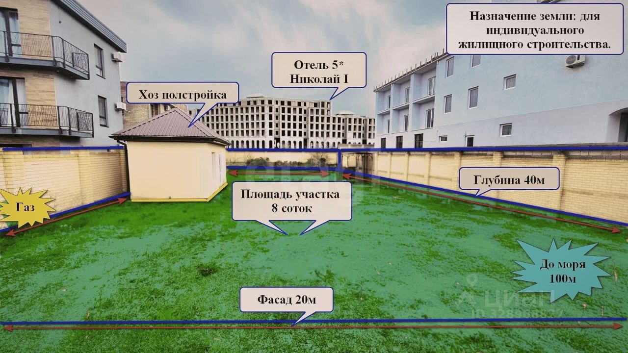 В продаже шикарный участок на первой береговой линии общей площадью 8 соток. Фасад участка 20 м, глубина 40 м., ограждение из кирпича. На участке имеется техническое здание. Коммуникации: свет 15квт, вода городская и скважина, канализация септик (рядом городская), газ перед участком (можно врезаться).