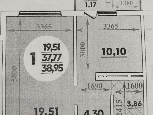 Общая пл. 41,7 кв.м.; кухня 10,1; комн. 19,5; с/у 4; прихожая 4; балкон 4.
