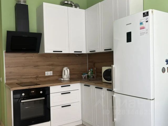 холодильник полноразмерный ноу-фрост, электроплита на 4-ре конфорки с духовкой, стиральная машина, кондиционер; большая деревянная кровать с матрасом, вместительный трёхстворчатый шкаф-купе; кухонные напольные шкафы, кухонный стол, письменный стол, стулья, табуреты; посуда, столовые приборы; окна оборудованы карнизами для штор, шторами, на балконе рулонные шторы день-ночь; на кухне выложен плиткой фартук, в санузле плиткой выложена зона ванной и раковины; интернет, домофон.