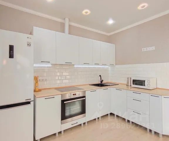 На кухне есть все необходимое для комфортного отдыха: холодильник с морозильной камерой, варочная поверхность, фильтрованная вода, тостер, чайник, микроволновка, капсульная кофемашина, красивая посуда для приготовления и сервировки.