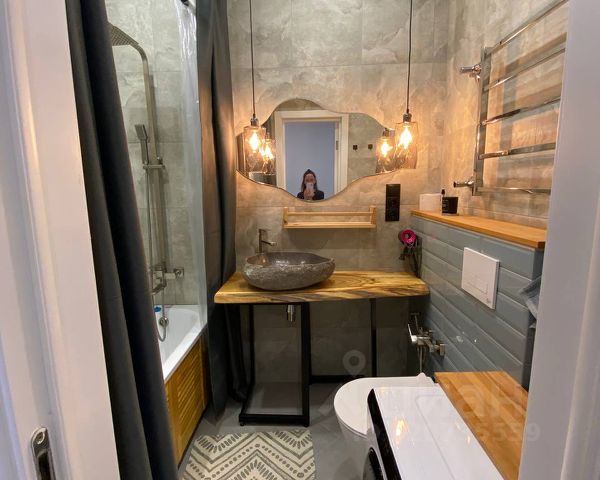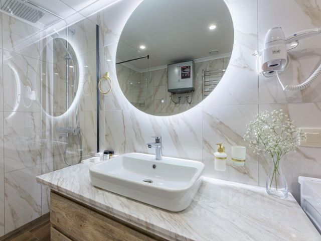 Просторный совмещенный СУ: душ, большая раковина, фен, стиральная машинка, полотенцесушитель.